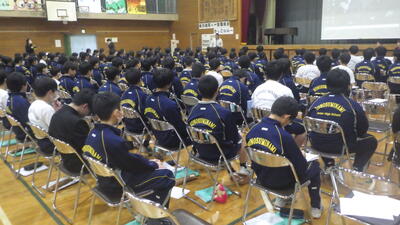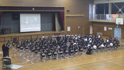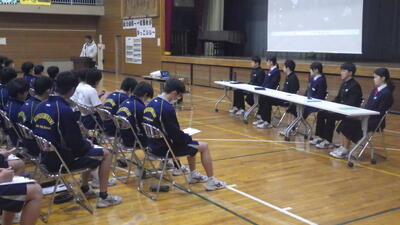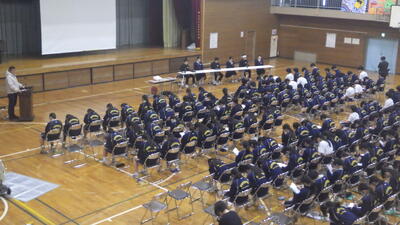 そんな余韻も若干残る中、本日は本校体育館を会場に1・2年生を対象とした進路学習会を開催しました。これは、先週末に本校を卒業した代表生徒から、実際の受験(検)経験を後輩たちに伝えるとともに、1・2年生の受験(検)に対する理解・意識・自覚を深めることを目的とした学習会となっています。