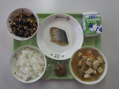 ごはん、牛乳、さわらの西京焼き、大豆の磯煮、けんちん汁、わらびもち